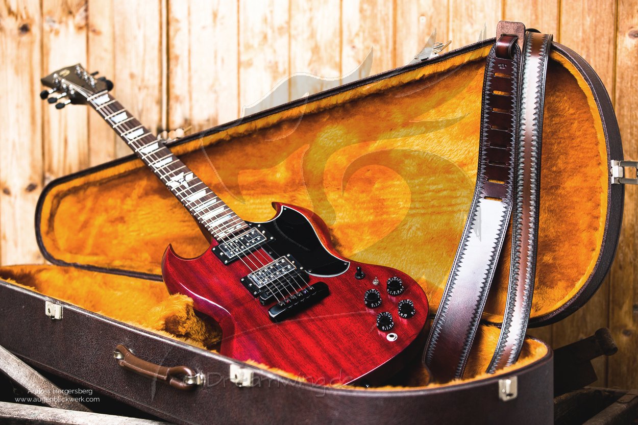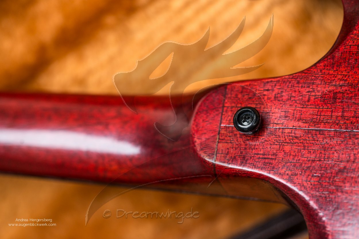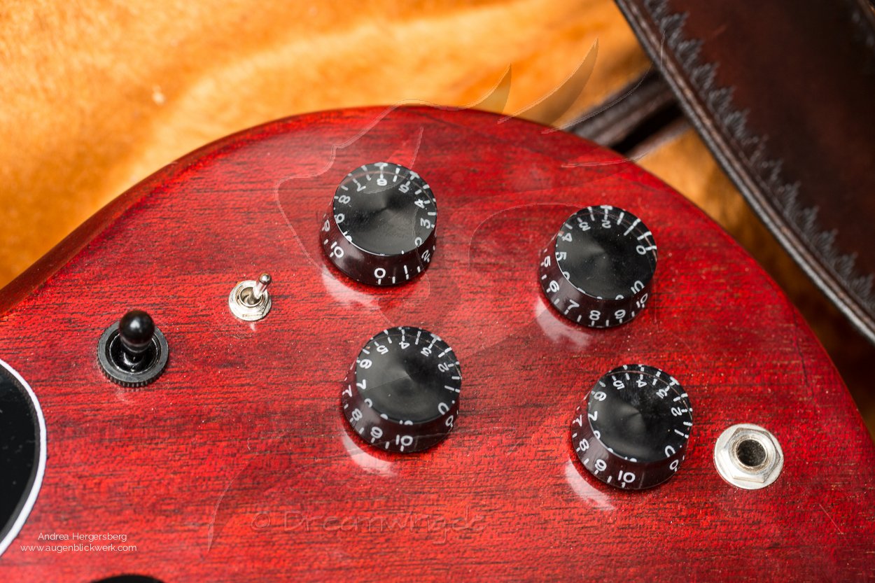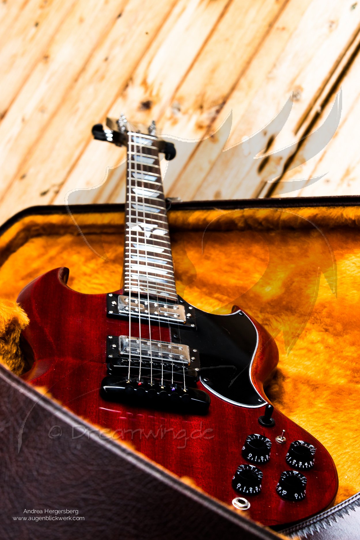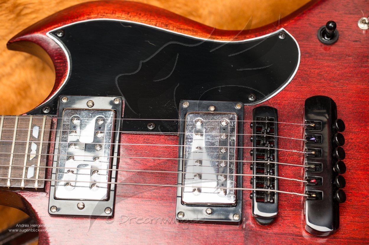 Mich hat die Gitarre von Tony Iommy schon lange fasziniert. Allein die Bauart mit 24 Bünden auf einer Gibson Mensur. Die Schaltung die Tony damals benutzte Ist heute nicht mehr aktiv und teilweise umgebaut. Ich habe mich bei meiner Ausführung für einen Humbucker am Hals und einen 3 Fach Split an der Brücke entschieden. Auf 1. Humbucker Serial, auf 2. Single-Coil-South und auf 3. Parallel Humbucker. Damit lässt sich eine wirklich große Klangbreite erreichen. Vom kristallklaren Klang einer Ovation oder Clarissa über satten Blues bis hin zu gewaltigem Heavy Metal ist alles drin. Sogar Soli in den höchsten Tönen durch den 24. Bund sind machbar. Durch das verwenden eines Null-Bundes ist mir auch eine extrem flache Seitenlage gelungen. Zurzeit ist ein .008 er Saitensatz aufgezogen der einem sehr schnellen Spiel sehr entgegen kommt.