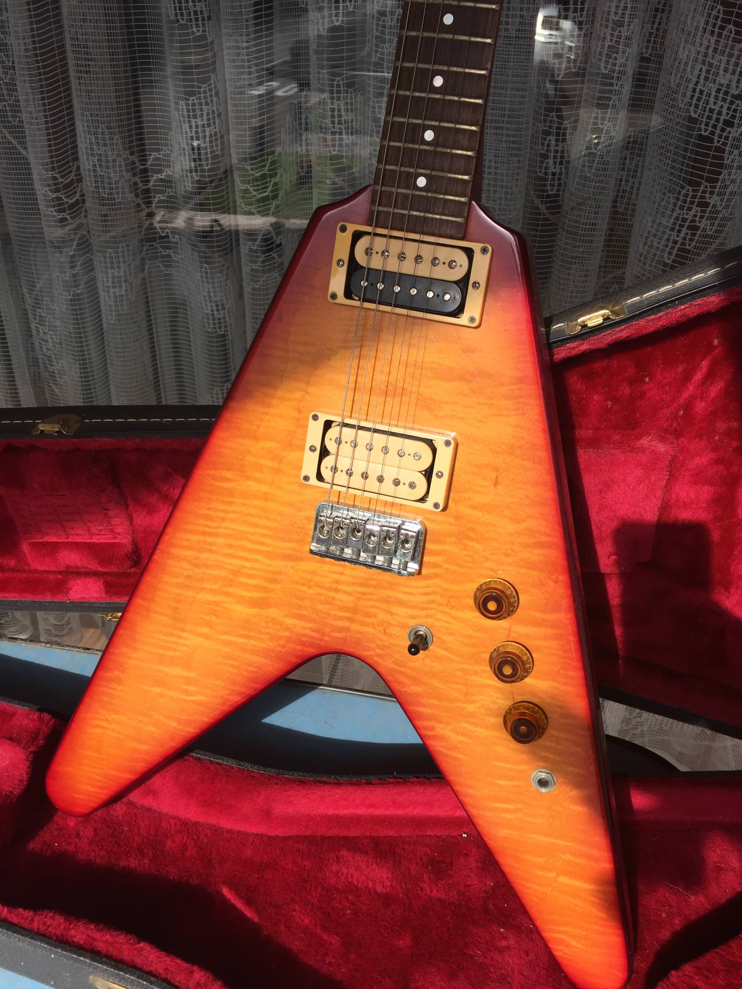 “The Ultimate™”: so selbstbewusst wie selbstverständlich verzierte einst dieses Statement die Garantiekarte einer Hamer Gitarre Anfang der 80er, in einer Zeit, in der sich große Namen wie Gibson und Fender noch Gedanken machten, wie sie die bescheidenen Qualitätsstandards der vergangenen Dekade und den dadurch erworbenen Imageschaden wieder ins Lot bringen könnten. Hamer setzte in den 70er und 80er Jahren hingegen auf Qualität, Innovation und Design, und ebnete (meiner bescheidenen Meinung nach) mit weiteren Protagonisten wie Charvel und Kramer den Weg für einen neuen Qualitätsgitarrenmarkt. Als sich diese Gütemaßstäbe nun aber auch bei Produkten aus Fernost wiederfinden ließen, und dies zu wesentlich günstigeren Prozesskosten … und folglich billigeren Marktpreisen, musste sich nun auch Hamer etwas einfallen lassen, um nicht nur im kleinen Premium-Segment stecken zu bleiben. So kam es zu einer Firmenpolitik, die sich (wohl zum Leidwesen des Hamer Mitbegründers und Qualitätsgurus Jol Dantzig) in einer teilweisen Produktionsverlagerung, günstigeren Asia-Modellen, aber auch im Verkauf der Firma an die Kaman Group, und (im Zuge des Kaman-Verkaufs) zuletzt an Fender äußerte. Unter dem Schirm von Fender und unter Mithilfe von Jol Dantzig scheint die Marke Hamer nun als US-Boutique Marke wieder aufzublühen, wobei auch weiterhin günstige Serien in Asien entstehen. Aber nun drehen wir das Zeitrad nochmals zurück, in die Jahre 1981 und ’82: nachdem die Vector, Hamer‘s Flying V Adaption, bereits als Kundenanfertigung existierte, wurde dieses Modell 1981 als limited edition aufgelegt. Die vorliegende Vector aus dem Jahre 1982 entstammt dieser Serie, die Hamer’s Modellpalette um einen weiteren Gibson-Klassiker erweiterte.