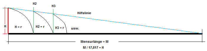 Man zeichnet die Mensur als gerade Linie auf. Teilt diese durch die Konstante und erhält „H“ als ersten Radius. Die beiden Endpunkte verbindet man mit einer Hilfsline. Nach dem der erste Radius mit dem Zirkel von der Hilfslinie auf die Mensurlinie geschlagen wurde ergibt sich so „H2“ als Radius für den 2.Bund. So fort geführt ergeben sich alle weiteren Bundierpunkte.